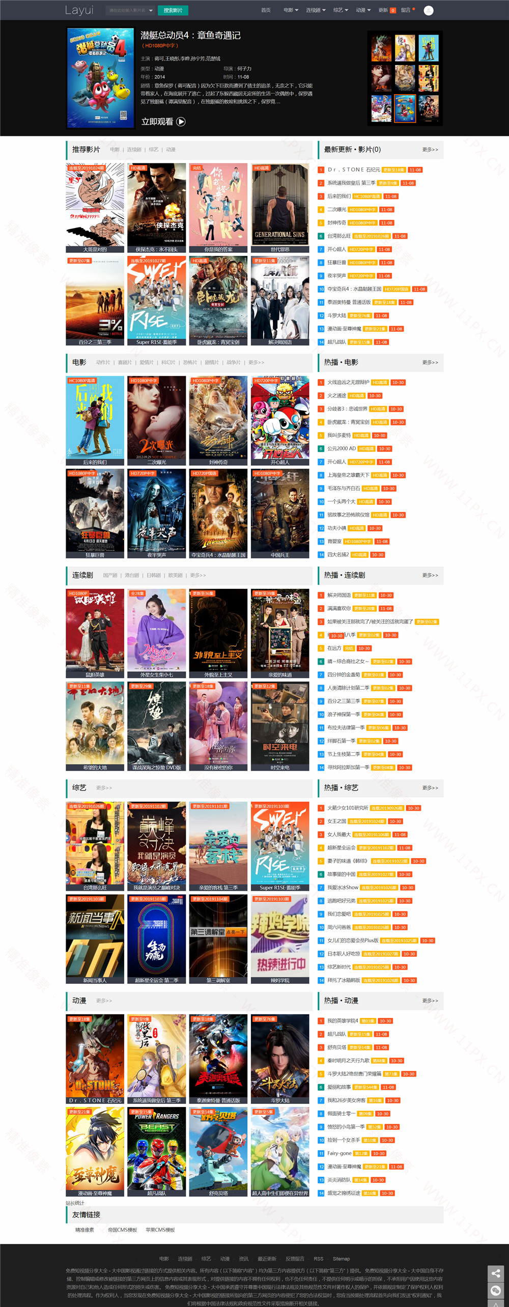 | 苹果CMS模板简介: layui框架自适应苹果CMS模板,自适应手机端,layui框架,苹果CMSV10版本。 苹果CMS模板安装教程:1、下载附件,解压到苹果CMS template目录内 2、后台系统-网站参数设置-网站模板,选择附件目录名称 3、生成首页就可以了 |