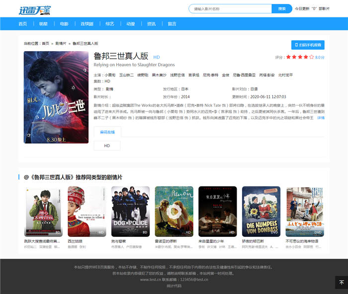 | 苹果CMS模板简介: 仿迅雷天堂苹果cms10模板,已测试完美无错,仿迅雷天堂主题模板,苹果CMSV10模板,自适应手机端。模板包含电影、资讯、留言板、搜索。 苹果cms模板安装教程:①上传到模板目录后台选择该模板即可。 |